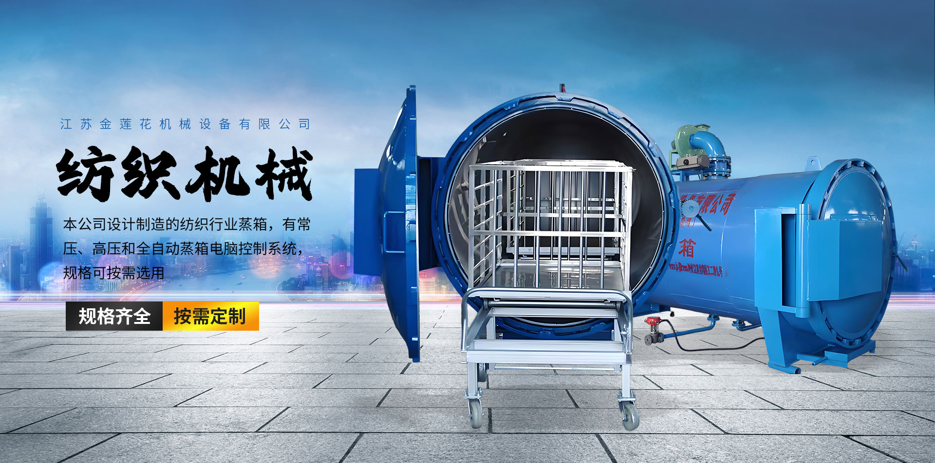 江蘇金蓮花機(jī)械設(shè)備有限公司位于魚米之鄉(xiāng)--金湖經(jīng)濟(jì)開發(fā)區(qū)金蓮花路1號(hào),源于金湖縣輕工機(jī)械有限公司,至今已有三十多年企業(yè)文化。公司專業(yè)制造用于紡織行業(yè)的快速系列蒸箱(蒸紗鍋、真空定型蒸箱、蒸紗機(jī)、紗線真空定型機(jī)、全自動(dòng)紗線定型機(jī)、棉紗調(diào)濕定型機(jī)、氨綸紗加濕定型機(jī)、高溫高壓蒸紗鍋、低彈絲真空定型機(jī)、不銹鋼蒸箱、毛條熱定型機(jī)、窗簾定型機(jī)、電加熱蒸箱、羊絨線加濕定型機(jī)、熱定型機(jī)、全自動(dòng)襪子定型機(jī)、面料染色定型機(jī)、模板壓褶定型機(jī)、凹凸定型機(jī))和全自動(dòng)蒸箱電腦控制系統(tǒng);一、二類壓力容器(泥漿分離器、換熱器、儲(chǔ)氣罐、蒸汽發(fā)生器、吸附塔、分氣缸、等等);各類減速機(jī),真空泵;各類閥。